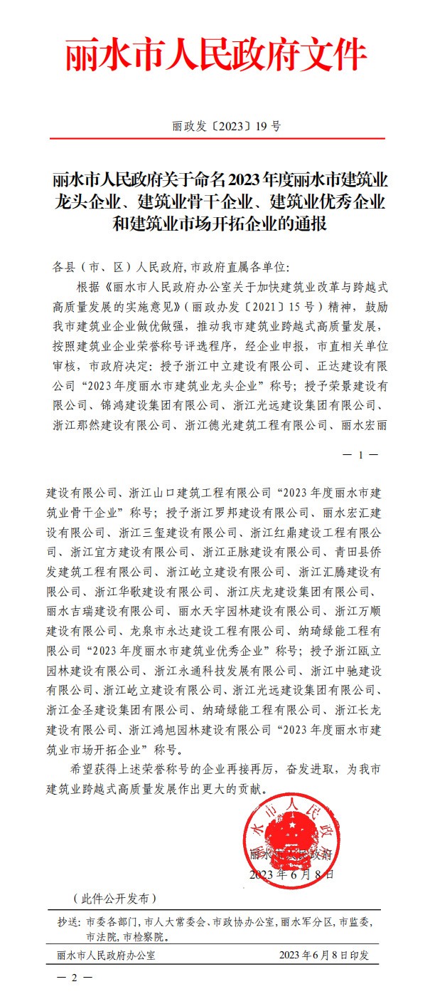 浙江甌立園林建設(shè)有限公司、浙江永通科技發(fā)展有限公司、浙江中馳建設(shè)有限公司、浙江屹立建設(shè)有限公司、浙江光遠(yuǎn)建設(shè)集團有限公司、浙江金圣建設(shè)集團有限公司、納琦綠能工程有限公司、浙江長龍建設(shè)有限公司、浙江鴻旭園林建設(shè)有限公司被授予“2023年度麗水市建筑業(yè)市場開拓企業(yè)”稱號。