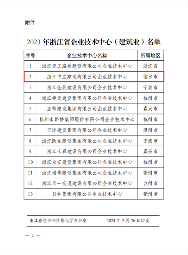 近日,浙江省經(jīng)濟(jì)和信息化廳等五部門公布2023年建筑業(yè)領(lǐng)域浙江省企業(yè)技術(shù)中心名單的通知,我公司企業(yè)技術(shù)中心榮獲2023 年建筑業(yè)領(lǐng)域浙江省企業(yè)技術(shù)中心認(rèn)定。