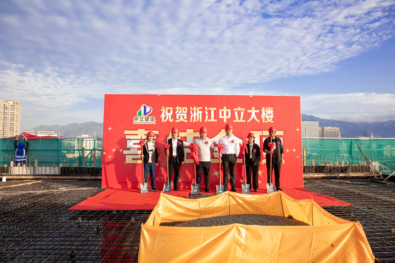 公司董事長周國強、副董事長周健、總經(jīng)理鐘鳴、副總經(jīng)理池甘萍、副總經(jīng)理葉麗紅等人共同拿起鐵鍬,為中立大樓澆筑結(jié)頂,迎來了歷史性的時刻。