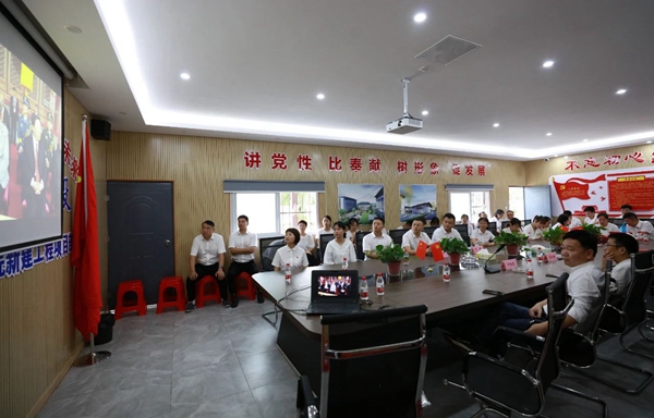 支部建在工地上!7月1日,公司黨支部書記鐘鳴、董事長周健帶領(lǐng)全體黨員、高層人員來到麗水電大蓮都學(xué)院新建工程項目,首先和項目工作支部全體黨員觀看慶祝中國共產(chǎn)黨成立100周年大會直播實況。